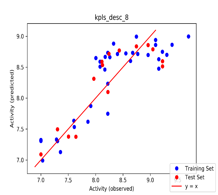 Auto QSAR is the compilation workflow of several processes, such as descriptor generation, feature selection and model training. For this study, Kernel-based Partial Least Squares (KPLS) was used as it extends the capability of the PLS. The QSAR model generation involves a few steps. The process begins with the selection of the datasets that include chemical structures and their corresponding biological activity. The descriptors were generated by importing the structures and topological descriptors were calculated and computed [24]. Following to which feature selection was made and computation was done. Finally, the models were validated using the datasets.