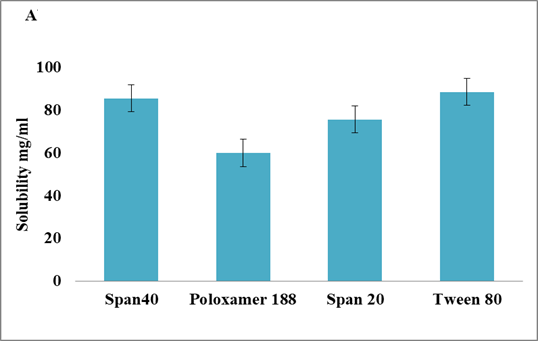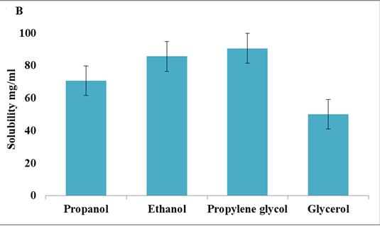 Fig. 2: Displays the solubility of licorice oil of (A) surfactants and (B) co-surfactants, values are expressed as mean±SD, n=3. Error bars indicate the SD values