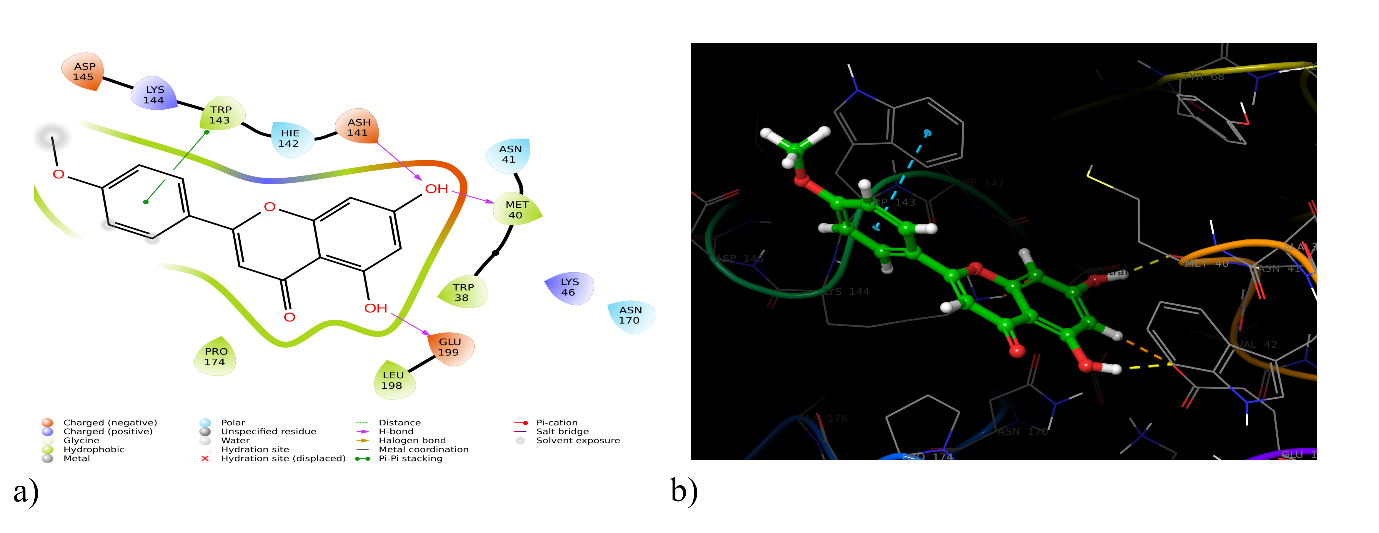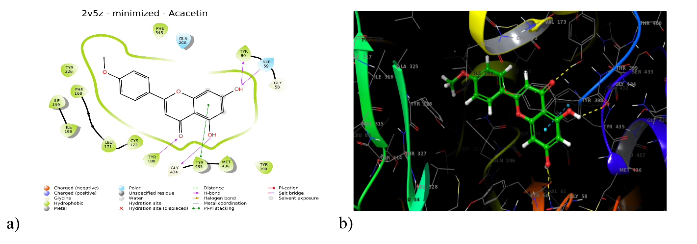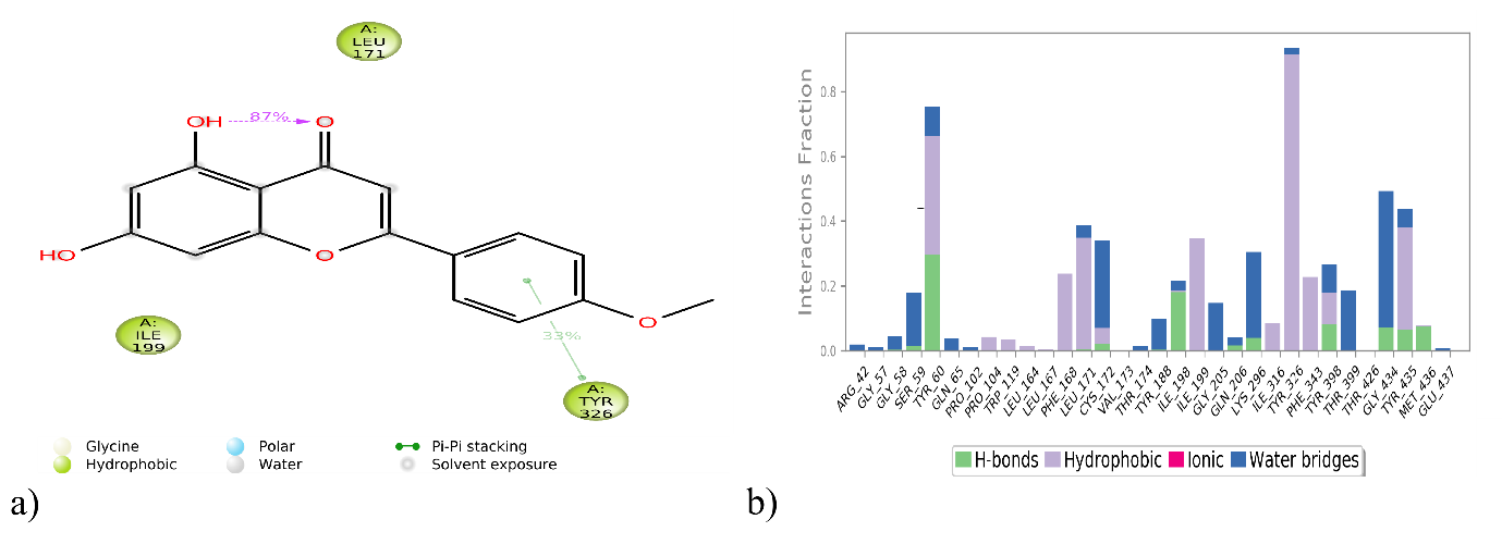 The Studies have investigated the potential capability of acacetin to inhibit the activation of the NLRP3 inflammasome, a crucial contributor to neuroinflammation, and have found that acacetin significantly suppresses inflammation in hyperactivated microglial cells [52]. Additionally, it has been observed to mitigate neuronal cell death and reduce microglial activation in a mouse model of ischemic stroke [53]. Consequently, these findings suggest that acacetin may act as a neuroprotective agent by inhibiting microglial activation, particularly in scenarios where microglial activation-induced inflammatory responses play a significant role in neuronal injury. Further validation of drug-protein interactions necessitates comprehensive pharmacological and clinical investigations.