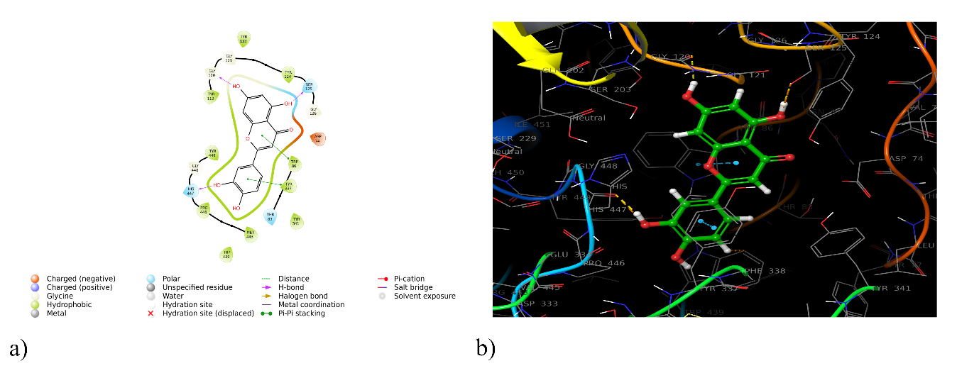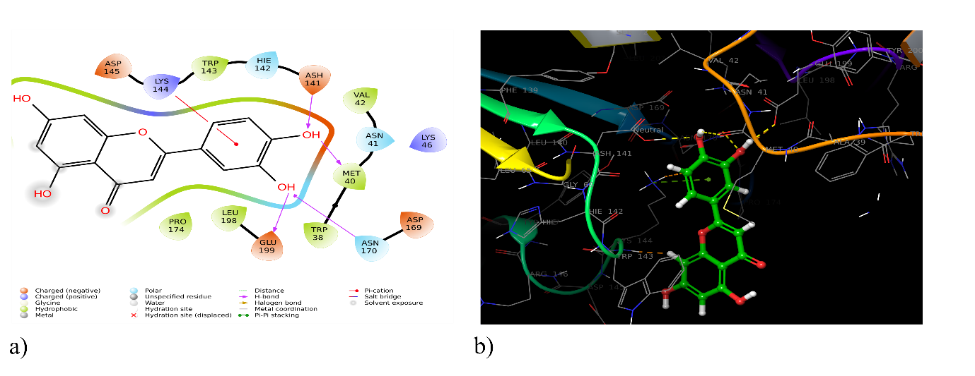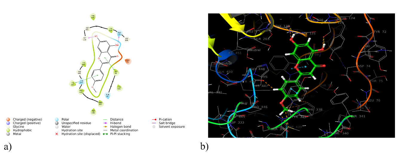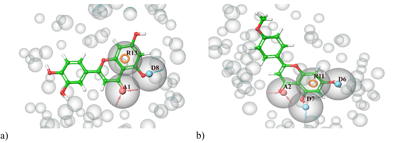 Chemically, luteolin is 3′, 4′, 5,7-tetrahydroxyflavone [45], and acacetin is 5,7-dihydroxy-4′-methoxyflavone [46]. In the case of luteolin, the 5,7-dihydroxy-4H-chromen-4-one is substituted with a catechol ring, whereas in acacetin, the anisole is attached, which is evident in pharmacophore modelling. The important pharmacophoric features of luteolin and acacetin responsible for the activity are the acceptor group, donor group, and aromatic ring. In the case of acacetin, an additional donor group (D6) is found, which may be responsible for the diminishment of activity compared to luteolin.