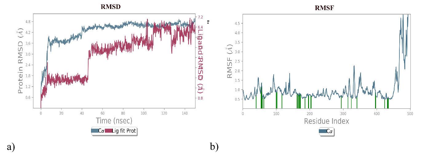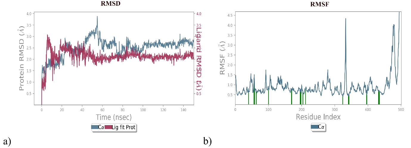 The MD study used the desmond module from Schrödinger Inc., USA. The Berendsen thermostat and barostat methods were employed for a 150 ns simulation. The simulation system utilised the NPT ensemble with a temperature of 300 K and pressure of 1.01325 bars. Before the simulation, the protein-ligand complex underwent energy minimization. Partial charges for the complex were determined during this process. The solvated system was placed in a TIP3P orthorhombic box. Neutralisation of each system was achieved by adding 0.15 M NaCl to the buffer. The system was further prepared using Protein Preparation, Ligand preparation, and Epik tools in desmond. Initial simulations were performed for ten ns in an NPT ensemble with a temperature of 300 K and pressure of 1.01325 bars. Molecular dynamics simulations were subsequently extended to 150 ns, with trajectory information collected for the remaining 2.0 ns [31]. Trajectory information generated plots depicting RMSD, RMSF, and hydrogen bonds. These plots provided insights into the stability and dynamics of the protein-ligand complex throughout the simulation. The comprehensive approach, including energy minimisation, explicit solvation, and advanced simulation parameters and tools, adds rigour to the study. The 150 ns simulation duration allows for a detailed analysis of the dynamics and stability of the best-docked protein-ligand complex. Including trajectory information further enhances the understanding of the system's behaviour.