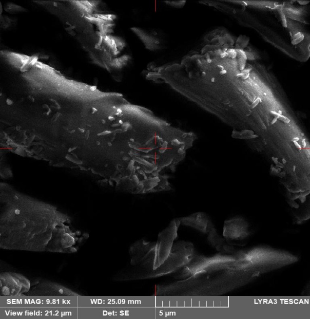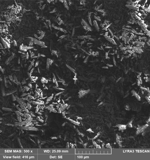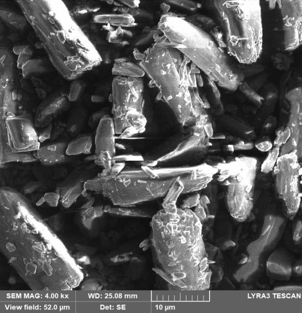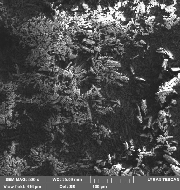 The size, shape and texture of the powdered specimens of the studied substance were estimated by the method of scanning electron microscopy (LYRA3, Tescan, Brno-Kohoutovice, Czech Republic) with pre-vacuuming the samples and removing excess charge from the surface by applying an amorphous carbon layer.