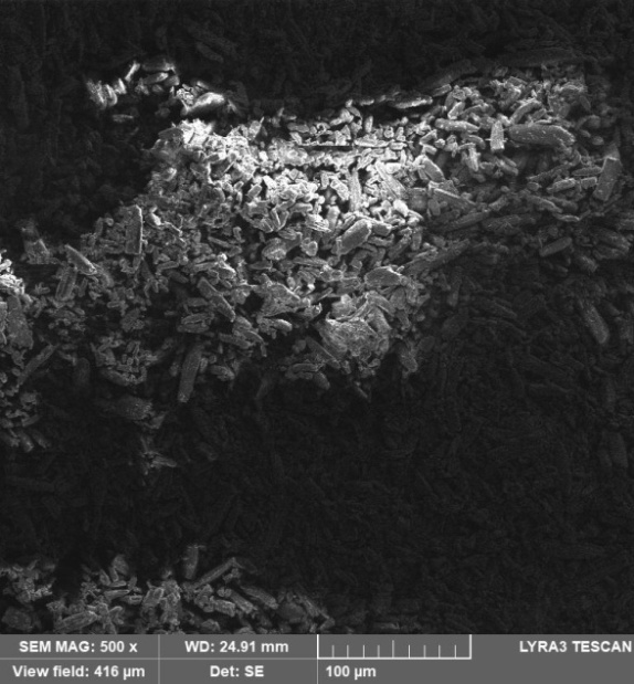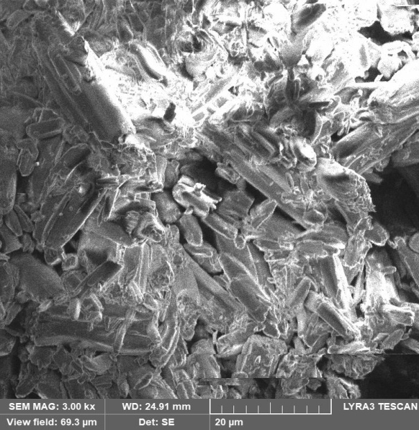 To study the properties of the lacosamide powder at various stages of mechanical activation, SEM images of the studies surface morphology at different magnifications were obtained: particles of the lacosamid_native substance at tMA=0 min are represented by needle-shaped druses with coarse surface and jagged edges their sizes vary from 30 μm to 50 μm (fig. 4).