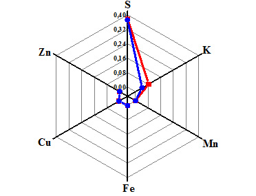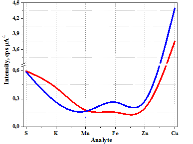 Fig. 7: X-ray fluorescence detection of elements in lacosamide-analite in units of fluorescence intensity (a); in units of concentration of the defined element (b): red curve corresponds to lacosamid_native (tMA=0 min), blue curve-lacosamid_90 (tMA=90) (a); in units of concentration of a certain element (b): the red curve corresponds to lacosamid_native (tMA=0 min), the blue curve-lacosamid_90 min (tMA=90)