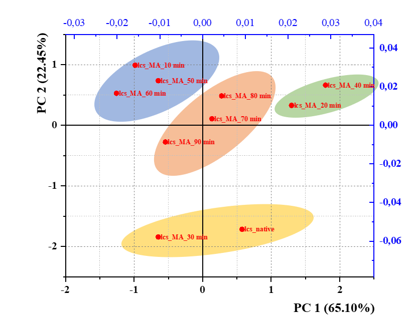 includes more than 3000 values of wave numbers (cm-1) for 10 samples of Lcs powder with different mechanical loading times. Then, using the capabilities of the OriginPro 2021 the initial matrix X was transformed into a set of values with corresponding coordinates-PC1-PC2. The measure that determines the level of similarity between the objects is the Mahalanobis distance [17]: