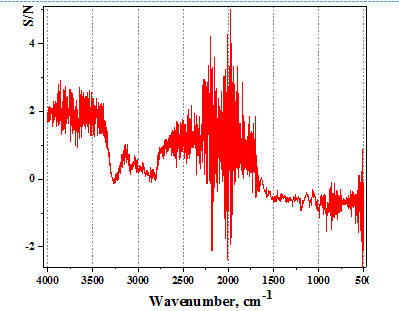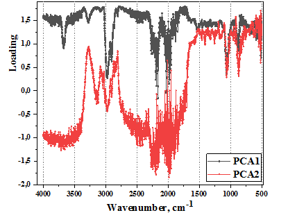 As shown in fig. 10, the whole range of wave number values contains information on variables other than zero values and supports the procedure for splitting the cluster of samples under study. In this case, both components (PC1 and PC2) are significantly different from zero in the entire spectral range from 4000 to 500 cm-1. The largest differences were recorded in the wavelength range of 3700 cm-1, 2900–3000 cm-1, 1750–2250 cm-1, which corresponds to N-H, O-H, C=O, C=N bond vibrations (table 5).