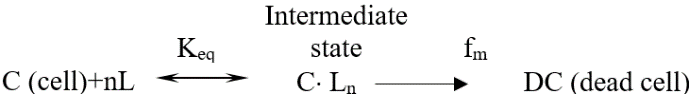 Fig. 13: The scheme of ligand-receptor interaction Sp. ambigua with lacosamide samples: C-cell, L-ligand, n-stoichiometric coefficient, C•Ln – intermediate state (cell after interaction with the ligand), Keq is the equilibrium constant fast stage, fm is the rate constant of the cell transition to the dead cell stage