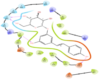 The next best drug that was selected in this study based on docking score, residue interaction, MMGBSA score, and IFD score was polydatin. Polydatin is a polyphenolic compound derived mainly from the roots of Polygonum cuspidatum that is enriched with a plethora of pharmacological uses ranging from being an anti-oxidant, anti-diabetic, anticancer agent, and many more [32].