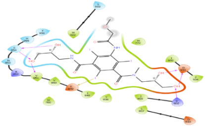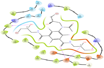 ADMET analysis: Five compounds deferred from the rule of five in less than 2 parameters, as shown in table 3. Following the analysis, seven compounds showed no related cardiac toxicity by blocking the HERG channel since their QPlog HERG value is greater than -5.0 [31-34]. The cell gut permeability QPPCaco values are less than 500, and QPlogBB values are negative, indicating that all ten compounds will not cross BBB and thus would not cause the undesired CNS effects, as shown in table 4.