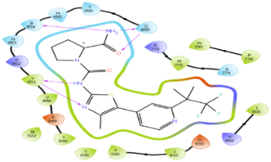 The docking scores of the top 10 molecules from XP docking were in the range of-13.084 to-10.736 and the MM/GBSA scores were in the range of-75.38 to-21.27 kcal/mol, the standard Alpelisib, which is the co-crystallized ligand showed a docking score value of-12.607 and an MM/GBSA score-72.37 kcal/mol. Alpelisib showed H-bonding interactions with the residues S854(H-bond interaction at the nitrogen of the amide group) and V851(2 H-bond interactions, one at the secondary amine and the other on the nitrogen of the thiazole ring). The best ligand in this study (Zinc ID: ZINC000003794794) showed better docking and MM/GBSA scores than the standard, as shown in table 1.