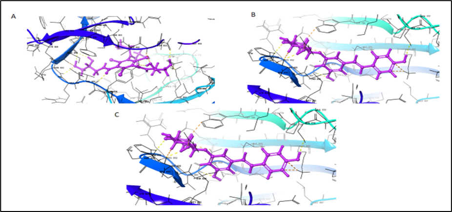Fig. 1: 3D ligand interaction diagram of the top 2 molecules and the standard alpelisib along with their IFD score; A: ZINC000003794794 (2198.21), B: ZINC000004098633 (-2199.24), C: Alpelisib (-2198.71)