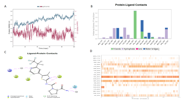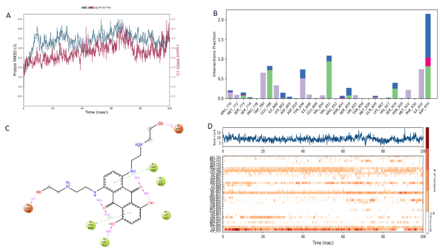 Fig. 2: ZINC000003794794 MD; A) RMSD plot of protein-ligand complex, B) Histogram of protein-ligand complexes, C) Diagram of protein-ligand contacts, D) Number of contacts and duration of contact with the protein