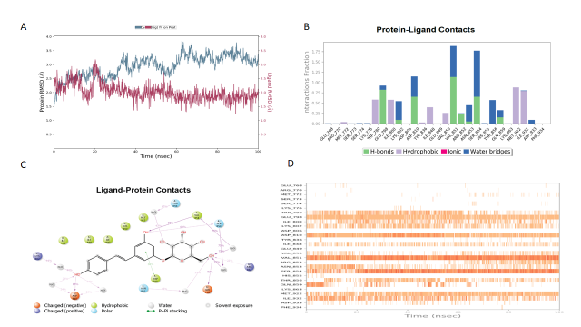 Fig. 4: Alpelisib MD; A) RMSD plot of protein-ligand complex, B) Histogram of protein-ligand complexes, C) Diagram of protein-ligand contacts, D) Number of contacts and duration of contact with the protein