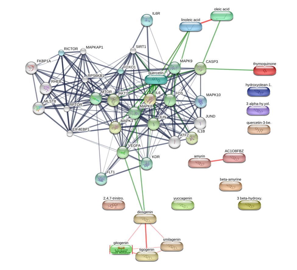 STITCH's database and analytical tool, called STITCH examines how bioactive compounds interact with the target protein. Fig. 1 depicts the development of the STITCH-based interaction network between metabolite chemicals in N. sativa L. and T. foenum-graecum and their target proteins. A medium level of confidence is indicated by STITCH results, with a minimum interaction score of>0.400 (medium confidence). The stronger the link between the bioactive molecule and its target protein, the thicker the interaction line. The STITCH interaction analysis indicates that five active substances: diosgenin, linoleic acid, oleic acid, thymoquinone, and quercetin interact directly with surface receptor proteins. Additionally, as a result of integration with STITCH, a network view is available to view the binding affinity of chemical compounds in an interaction network. STITCH briefly explains how a molecule could affect its interaction partner [25]. Moreover, the quantity of intracellular proteins on that surface signifies the transition from chemical signals (extracellular) to intracellular signals.