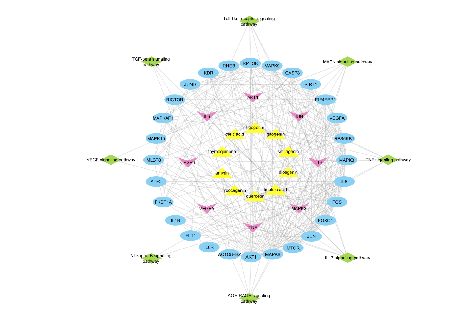 Conclusion: Based on network pharmacology analysis, we determine that N. sativa L. and T. foenoem-graecum combination can potentially treat DW.