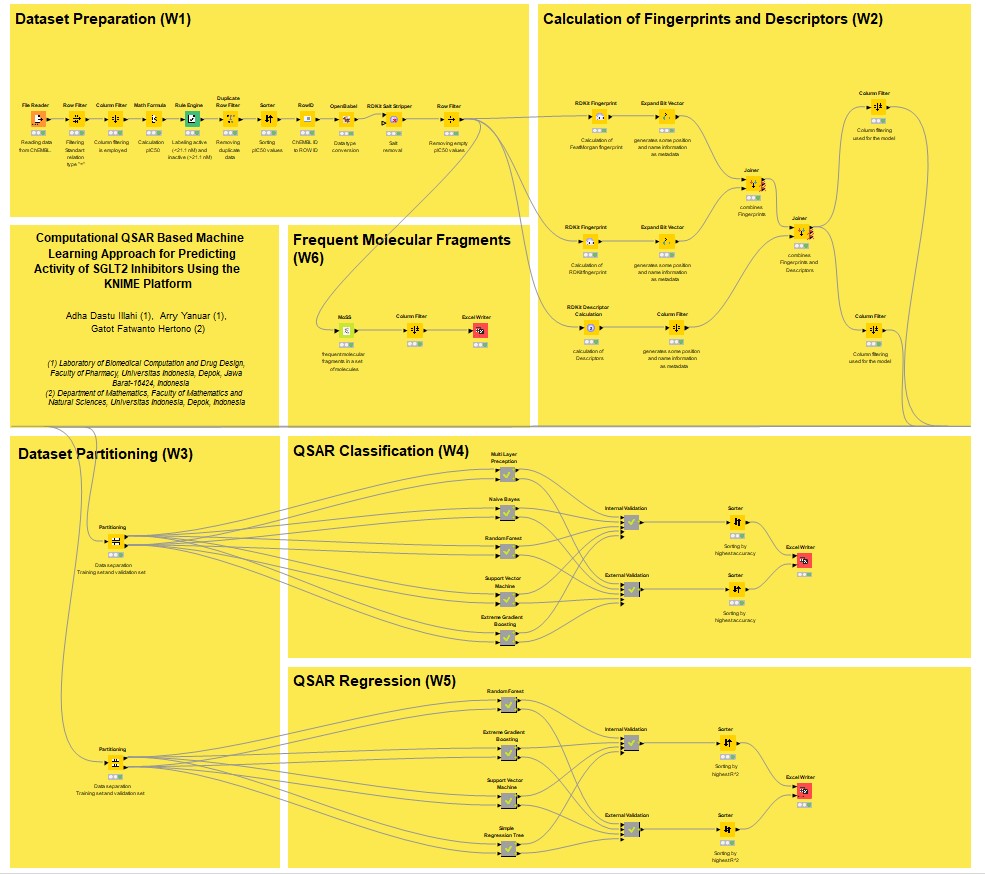 The QSAR process aided by Machine Learning (ML) has significant advantages due to ML’s ability to recognize complex patterns in chemical data, enabling more accurate and efficient predictions [9–11]. One platform that can be utilized is Konstanz Information Miner (KNIME). KNIME is an open-source data analysis platform popular among computational scientists, providing an intuitive visual interface for building complex data analysis workflows, including QSAR model implementation [12]. Using KNIME, researchers can easily integrate various analytical tools and visualize the results [13].
