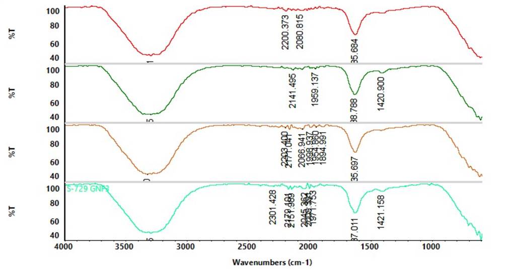 The FTIR spectra could be used to get information about molecular structure from the vibration of functional groups at a certain wavenumber [13]. The FTIR spectra of N nanoparticles are shown in fig. 3.