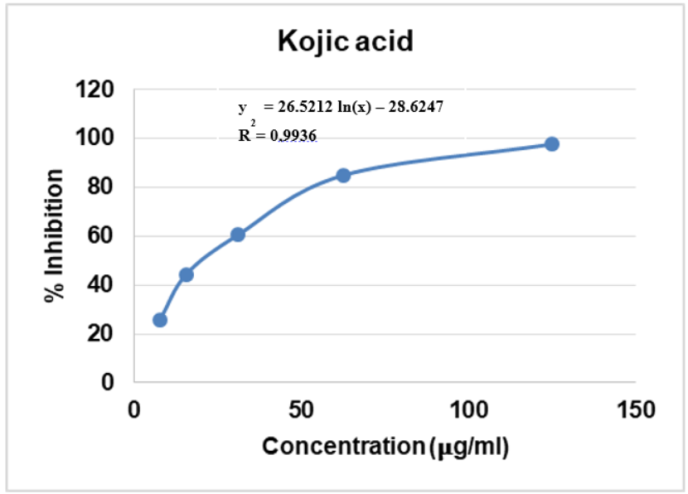 An amount of 5 mg of kojic acid powder was weighed, put into a 10.0 measuring flask ml, dissolved in 50 mmol phosphate buffer solution pH 6.5, to obtain a solution of kojic acid with a concentration of 500 µg/ml. Then, 5.0 ml of kojic acid solution 500 μg/ml was pipetted then put into a 10.0 ml volumetric flask, obtaining a concentration of 250 µg/ml. Next, dilution was carried out until kojic acid solution of 125; 62.5; 31.25; 15.625; and 7.8125 µg/ml as a concentration variation to obtain the IC50 value [21].