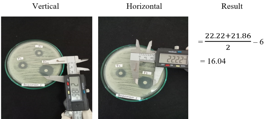 The antifungal activity test was conducted with three repetition of test by measuring the diameter of inhibition from vertical and horizontal length then subtracting the disc diameter, which is 6 mm. The measurement from F3 (Shampoo containing 15% of corn silk extract) inhibiton zone can be seen in the picture below.