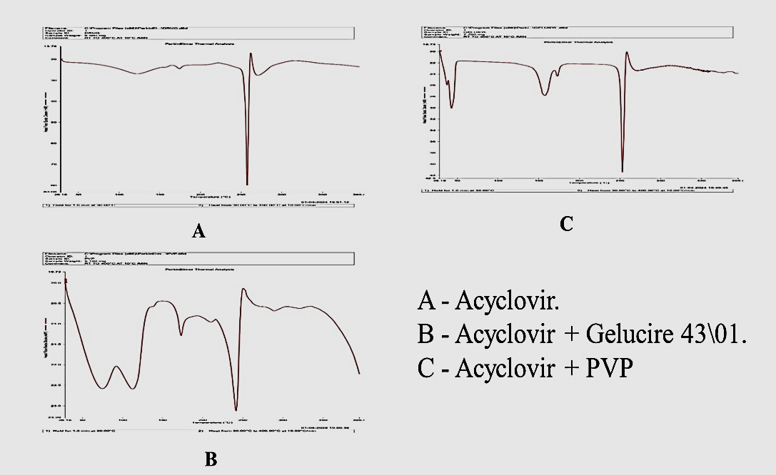 Differential scanning calorimetry (DSC) curves of pure Acyclovir, Acyclovir with Gelucire 43/01, and Acyclovir with PVP were generated using a Perkin Elmer thermal analysis instrument. The samples weighed 9.58 mg, 7.700 mg, and 5.150 mg, respectively. The temperature was ramped from 30 °C to 400 °C at a rate of 10 °C/min during the analysis [6].