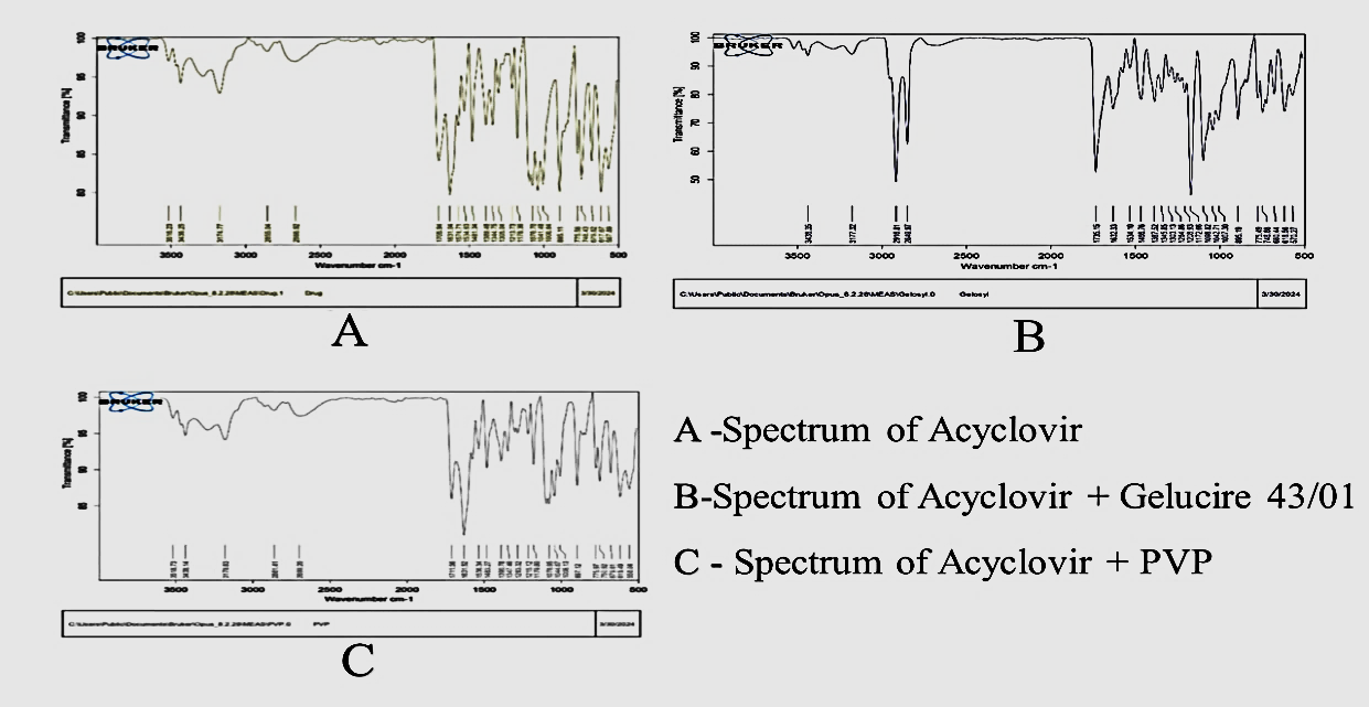 Fourier Transform Infrared Spectroscopy (FT-IR) analysis was conducted to investigate the interactions between Acyclovir and polymers (Gelucire 43/01 and PVP). The FT-IR studies were performed using a PerkinElmer FT-IR spectrometer with a spectral range. The absorption peaks of the drug and excipients were observed within the range [7]. The spectra were recorded and analyzed using FT-IR BRUKER software.