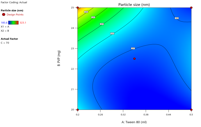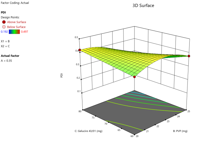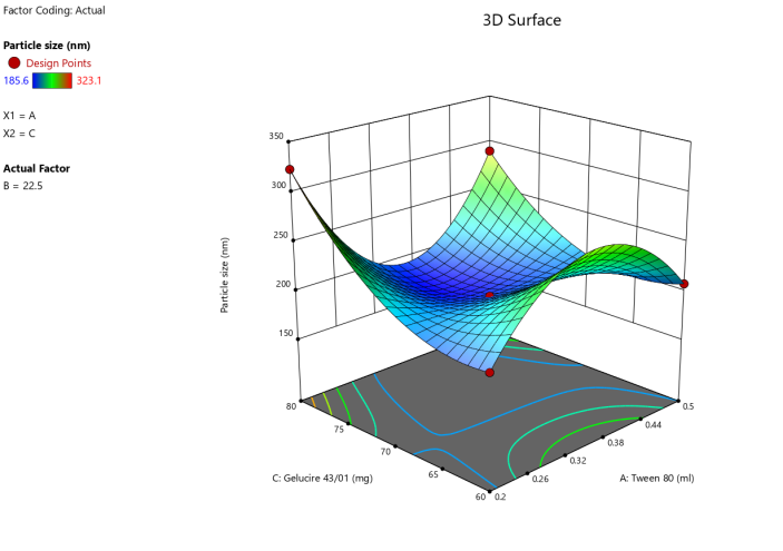 Built-in analysis tools were utilized for visualizing or calculating effects, including second-order polynomial equations to account for interactions and quadratic terms. The model fit, P-values, ANOVA, and diagnostic graphs for the responses were examined. The model was confirmed by comparing predicted and observed values using the 95% confidence interval and P-value [12].