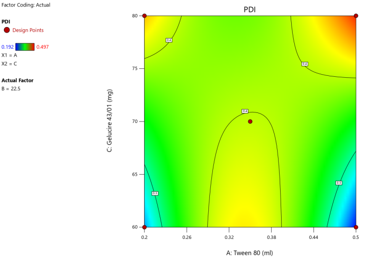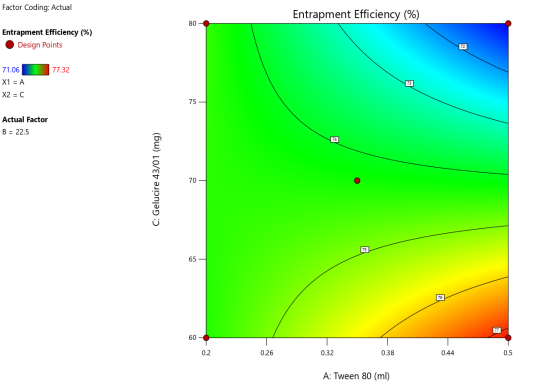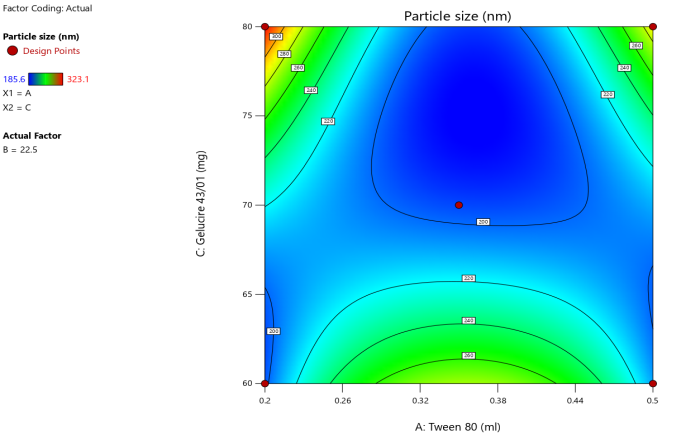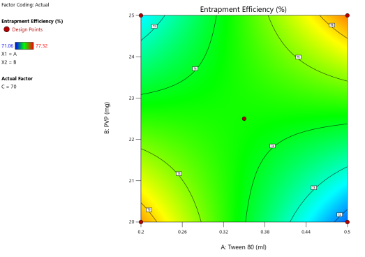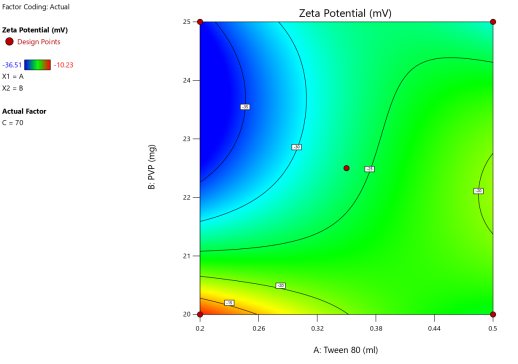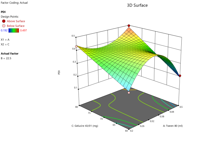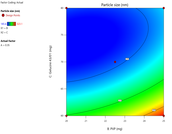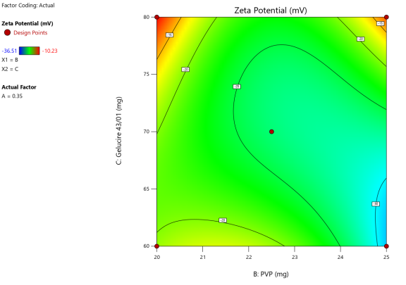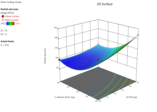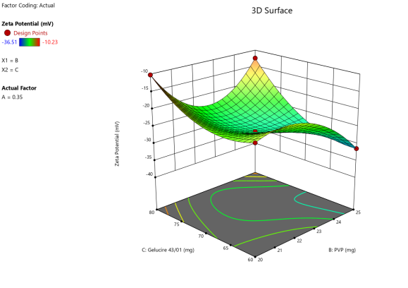 | A: Tween 80 | B: PVP | C: Gelucire 43/01 | Particle size | PDI | Zeta potential | Entrapment efficiency |