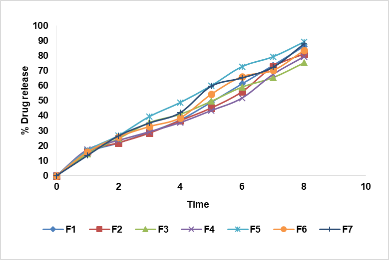 Fig. 9: In vitro drug release curve of nanoparticle from F1-F7. All data showed as mean (n=3); where n is the number of observations