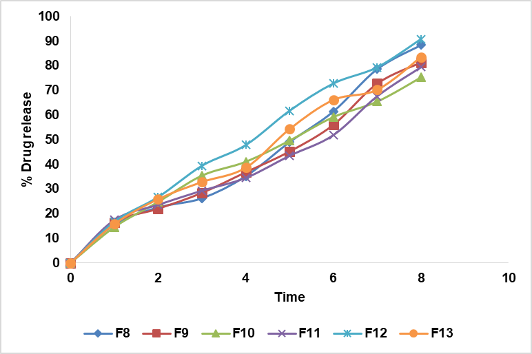 Fig. 10: In vitro drug release curve of nanoparticles F8-F13, all data are presented as mean (n = 3), where n is the number of observations