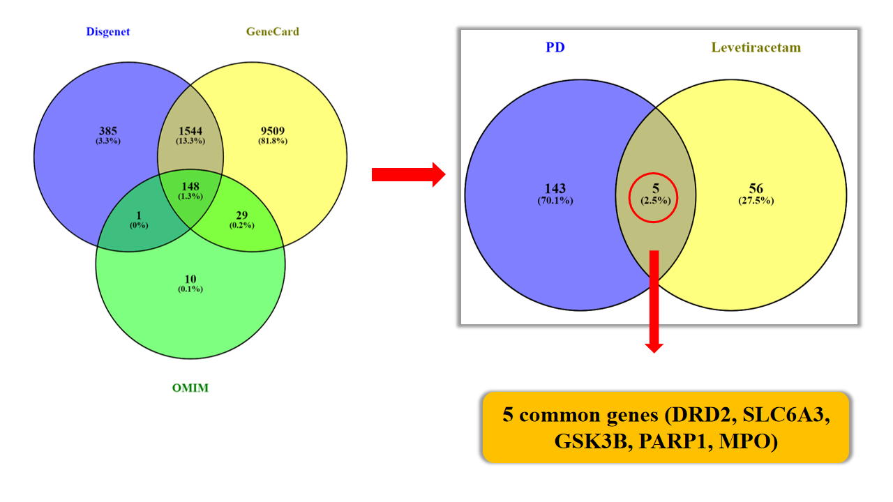 Fig. 1: Five common genes are depicted by the venn diagram's overlapping set: DRD2, SLC6A3, GSK3B, PARP1 and MPO. These genes are identified as common targets associated with both PD and the effects of Levetiracetam
