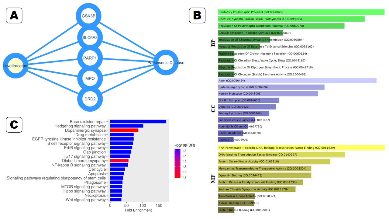 Fig. 2: Analyzing the five predicted protein targets, conducted GO and KEGG enrichment analyses. (A) The network diagram illustrates the connections between Levetiracetam and PD, focusing on the common targets and associated pathways. (B) The shared targets' GO enrichment study reveals different biological processes (green plot), cellular components (blue plot) and molecular functions (yellow plot). Notably, "Excitatory Postsynaptic Potential" (GO: 0060079), "Axon" (GO: 0030424) and the most important annotations in biological processes, cellular components and molecular activities, respectively, are " Ribonucleic acid Polymerase II-specific Deoxyribonucleic acid-binding transcription factor binding" (GO: 0061629). (C) For KEGG pathway enrichment analysis, we explored the commonly predicted five targets of Levetiracetam in treating PD, represented by bar charts where the bar size indicates the number of genes annotated in the respective KEGG pathways
