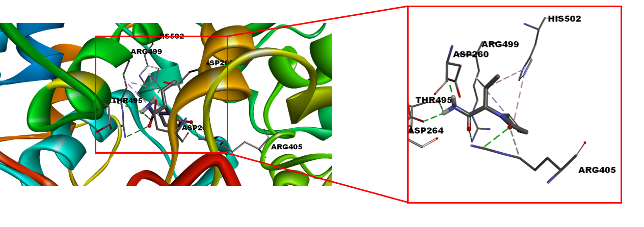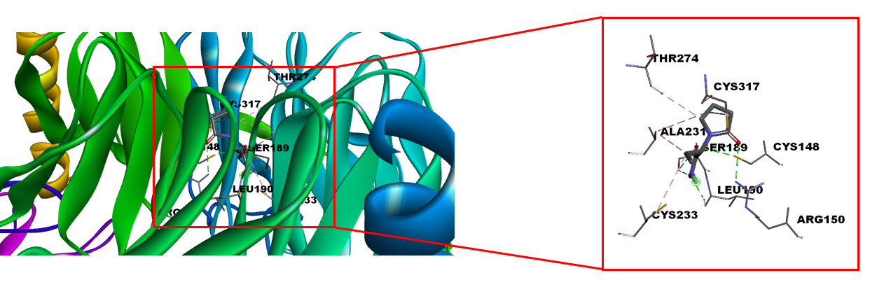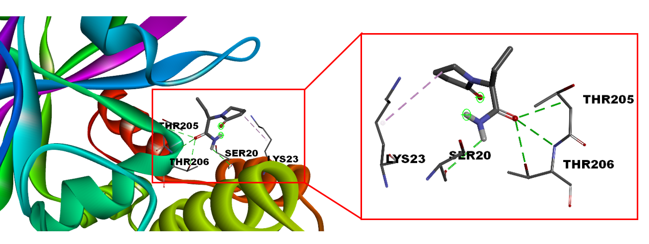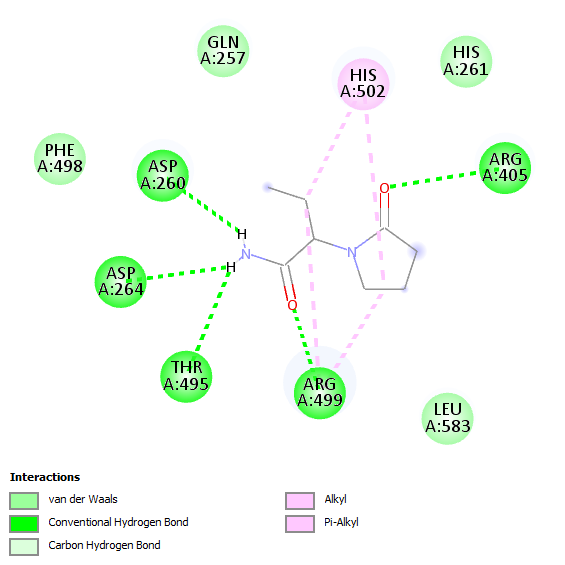 The resultant docked complexes were analyzed based on binding affinity, measured as the minimum binding energy in kcal/mol. Subsequently, Discovery Studio Client 2021 software [26] was employed to scrutinize 3D ligand-protein interactions and generate two-dimensional interaction figures. In-depth analysis encompassed the evaluation of hydrogen bonds, hydrophobic bonds and pi-alkyl interactions within the docked complexes.