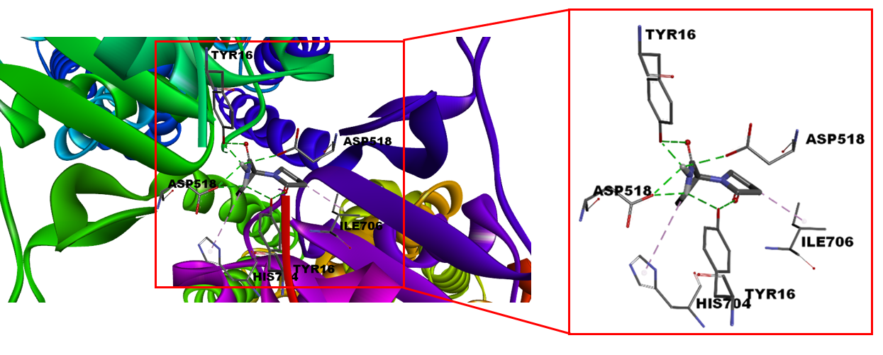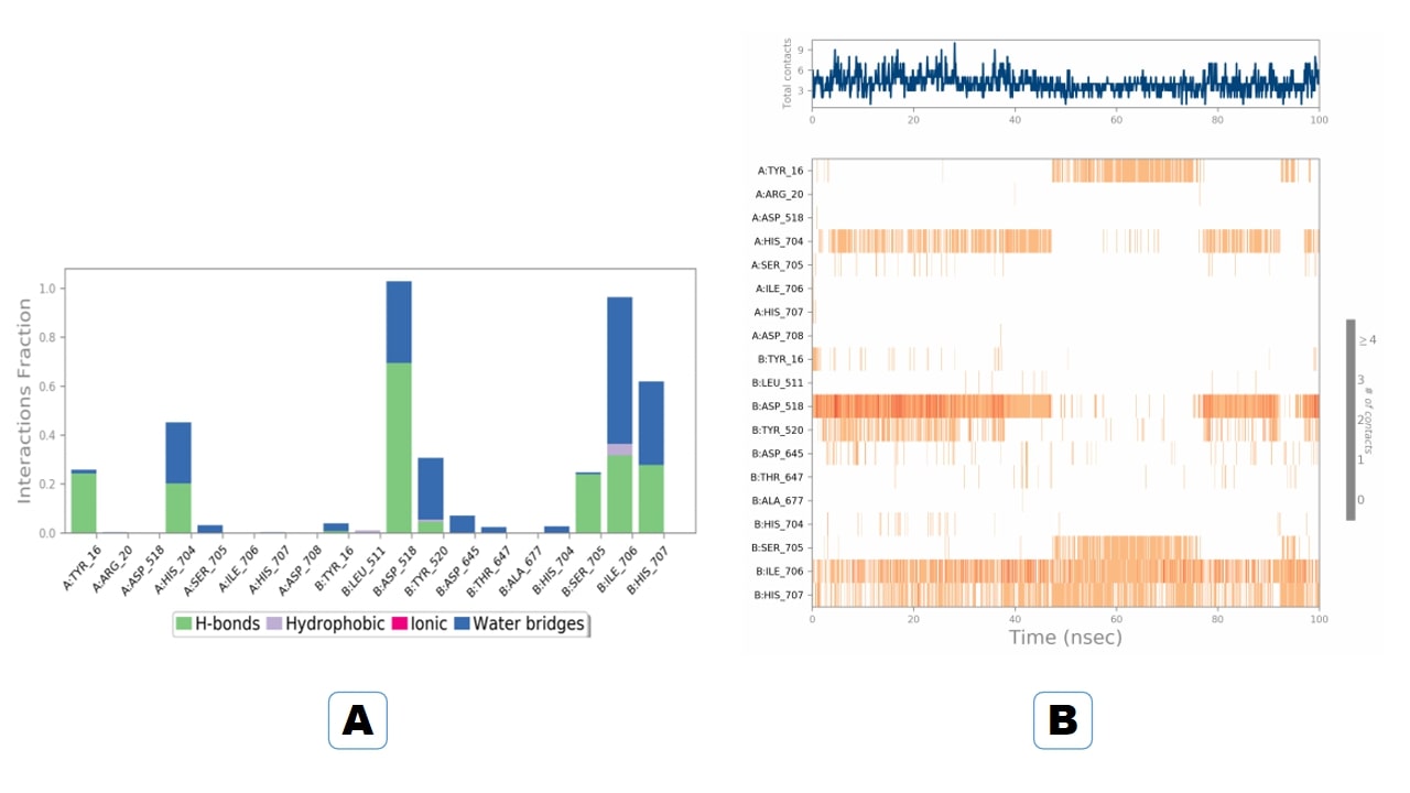 The timeline illustrates the several interactions that take place during the MD simulation, including H-bonds, hydrophobic, ionic and water bridges. The histogram shows the total number of distinct interactions that occurred between the ligand and the protein during the simulation. Additionally, it highlights the specific amino acid residues engaged with the ligand (levetiracetam) throughout the simulation. Notably, amino acids such as TYR 16, ASP 518, SER 705, ILE 706, HIS 707 demonstrate more pronounced interactions with the ligand, depicted by a distinct shade of orange on the plot, as indicated by the color scale on the side (fig. 7).