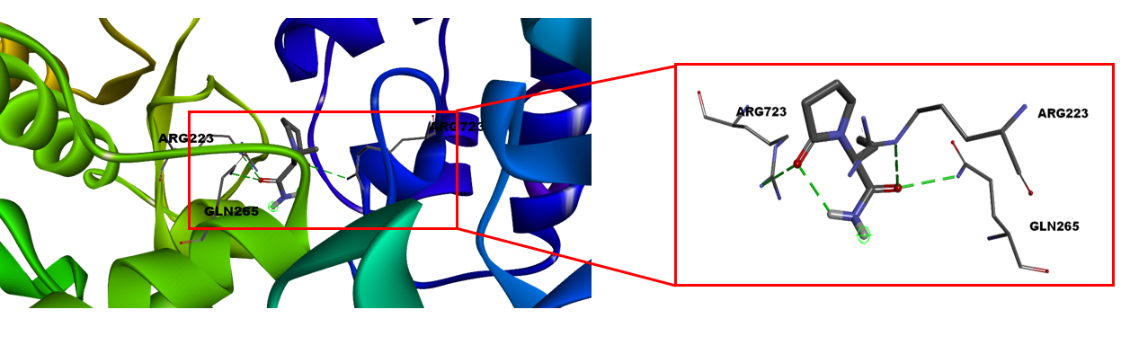 Fig. 3D: Docked complex of PARP1 (PDB ID: 3GJW) with levetiracetam. Green line: hydrogen bond interaction; purple line: Pi-alkyl interaction