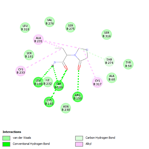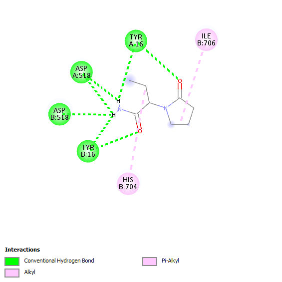 Fig. 3C: Docked complex of GSK3B (PDB ID: 1JIB) with levetiracetam. Green line: Hydrogen bond interaction; Purple line: Pi-alkyl interaction