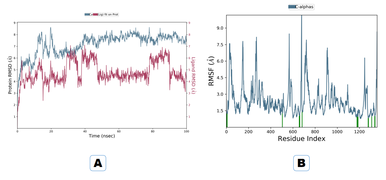 The stability and structural alterations of Levetiracetam within the SLC6A3 drug binding site were examined. Numerous analyses were carried out, including Radius of Gyration (RoG), Molecular Surface Area (MolSA), Solvent Accessible Surface Area (SASA), Polar Surface Area (PSA) plots, Protein-ligand RMSD and Protein Root mean Square Fluctuation (RMSF). During a 100 ns molecular MD simulation, RMSD gauged the average displacement of atoms relative to a fixed frame, revealing an average deviation. The Molecular Mechanics Generalized Born Surface Area [MMPB(GB)SA] Energy calculation for the docked complex yielded-0.97 kcal/mol (refer to fig. 4). Notably, the Levetiracetam-SLC6A3 complex (lig-fit-prot) achieved stability within the initial 50 ns, maintaining equilibrium throughout the simulations at distances of 3 and 7Å, respectively (see fig. 5A). Analyzing the RMSF revealed protein chain alterations during Levetiracetam interaction with SLC6A3, observing amino acid residue fluctuations within a 100 ns simulation, with a maximum fluctuation of 3 Å (depicted in fig. 5B).