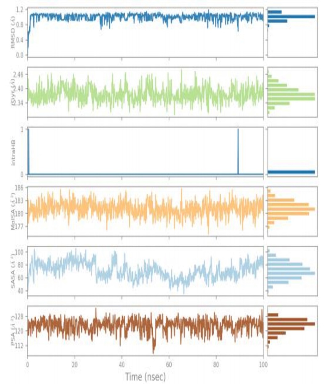 MD simulation of the top-scored protein target (SLC6A3) with Levetiracetam were represented the formation of Hydrogen bond and hydrophobic interactions in the active site region. Fig. 6 illustrates the representation of the Radius of Gyration (RoG), MolSA, Solvent Accessible Surface Area (SASA) and Polar Surface Area (PSA).