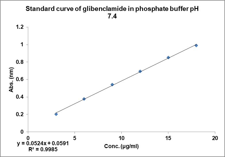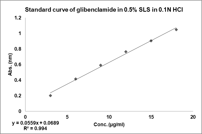 The calibration curve of glibenclamide in 0.5% SLS in 0.1 N HCl and phosphate buffer showed good linearity with regression coefficient value 0.994 and 0.998, respectively, confirming that it follows the Beer-Lambert’s law [29] as seen in fig. 2 and fig. 3.