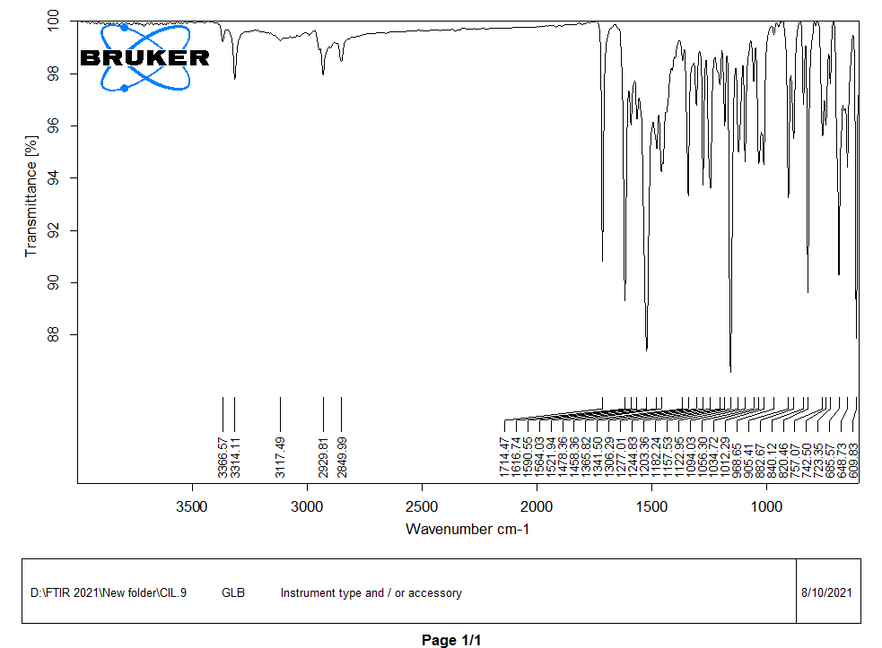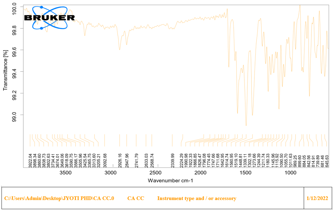 FTIR spectroscopy was conducted using an FTIR Alpha Bruker 12060280 (Germany) spectrophotometer to investigate potential interactions among the components used. Initially, background scanning was performed. A small amount of the sample was then blended with IR-grade Potassium Bromide (KBr), and this mixture was placed in the sample cell. The FTIR spectrophotometer was employed to analyze the sample over a range of 400-4000 cm-1 at room temperature [24, 25]. Baseline correction was carried out following scanning, and the spectrum was smoothed twice to achieve clear peak values.