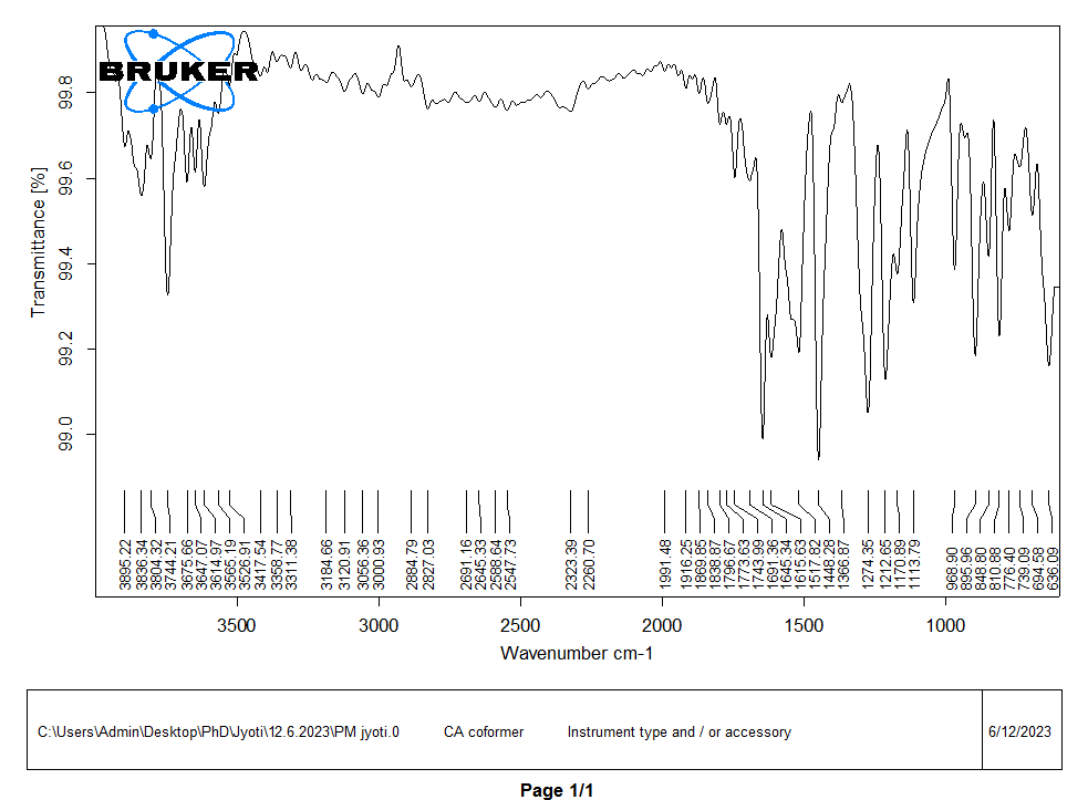 Some peaks were also shifted in the physical mixture of the drug and coformer for example, the 3417 cm-1 of the coformer and 1716 cm-1 of the drug shifted to 3446 cm-1 and 1700 cm-1, respectively. The intensity of these peaks was lower than that of the drug and coformer.