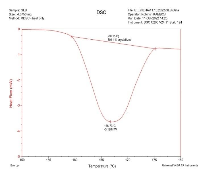 DSC analysis was also carried out for GLB, caffeic acid, the physical mixture, and the cocrystals, as shown in fig. 6. The drug (GLB) and coformer (caffeic acid) showed sharp peaks a 166.73 °C and 218.47 °C, respectively. The Physical Mixture (PM) exhibited an endothermic peak at 162.889 °C, while the cocrystals had a sharp endothermic peak at 157.18 °C, which was lower than those observed in GLB and the coformer [16]. The peaks observed in the physical mixture were not very sharp and resembled those of the cocrystals. This could occur as a result of minimal or partial contact between the coformer and API in the physical mixture [34]. As a result, a peak of lower intensity in the physical mixture might have formed close to that of the cocrystals. During the analysis, the sharp peak observed in the DSC confirmed the formation of cocrystals.