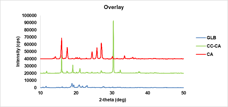 Crystallographic analysis was performed using the XRD analytical process to define the crystalline nature of the glibenclamide-caffeic acid cocrystals. The XRD analysis of the synthesized GLB-CA cocrystals showed prominent peaks at various 2Ɵ values, indicating the crystalline nature of the particles. The respective peaks of glibenclamide were found at 2Ɵ values of 11.6, 18.86, 20.9, 23.1 [35]. These observed peaks of glibenclamide confirm the crystalline nature of the drug. In the coformer, diffraction peaks were found at 2Ɵ values 9.36, 12.84, 16.52, and 17.18, which confirm the crystalline nature of the coformer. In XRD analysis of the cocrystals, new peaks were observed, or existing peaks were shifted to different positions. The XRD pattern of the cocrystals showed peaks at 2Ɵ values of 15.96, 30.4, and 30.38. The observed peaks of the drug and coformer were absent in the cocrystals. Additionally, the intensity of the observed peaks in the XRD pattern of the cocrystals was higher compared to the peaks observed for the drug and coformer [31]. This suggests the preparation of a new compound with a crystalline nature. Fig. 8 shows the XRD patterns of the drug (GLB), coformer (CA), and cocrystals.