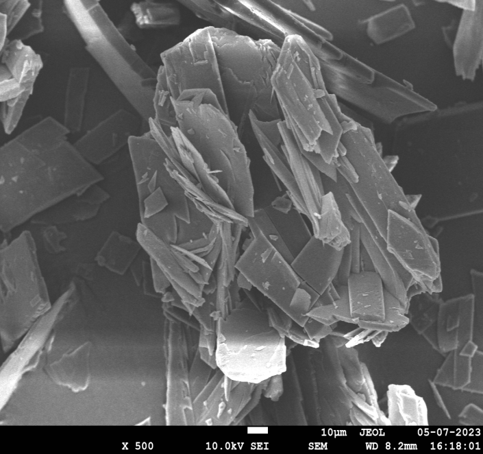 SEM analysis helps to determine the surface morphology of the final formulation. The images obtained during scanning electron microscopy of glibenclamide cocrystals prepared with caffeic acid exhibit a crystal-shaped geometry [36]. In HSM, glibenclamide cocrystals also appeared crystalline. These results confirm that the final formulation is also crystalline. Fig. 9 shows the SEM images of GLB-CA cocrystals at different magnifications.