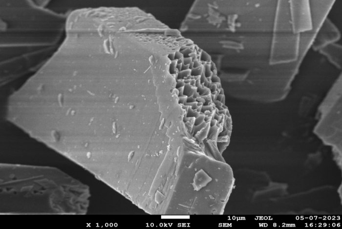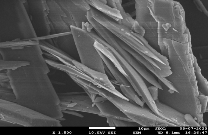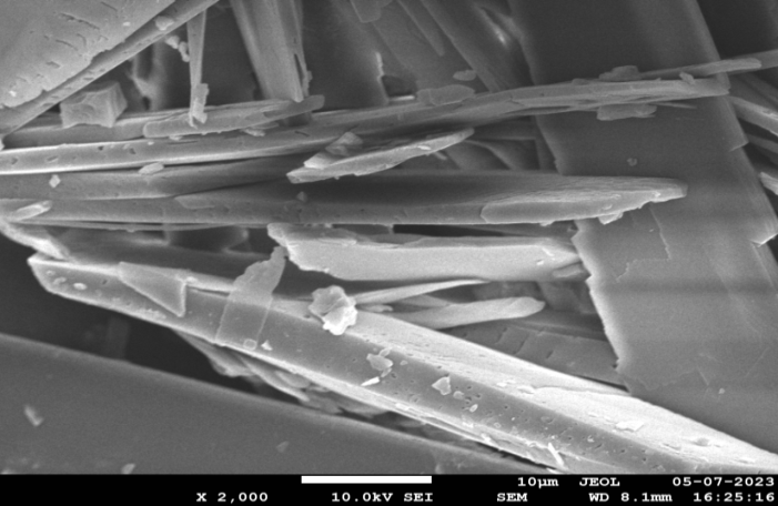 SEM analysis of samples was performed using a JEOL 7610F Plus instrument to examine surface morphology. The scanning electron microscope operated at 10 kV while the sample was placed in the chamber, and images were captured at varying magnifications.
