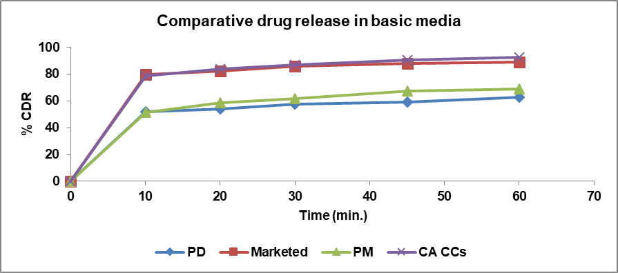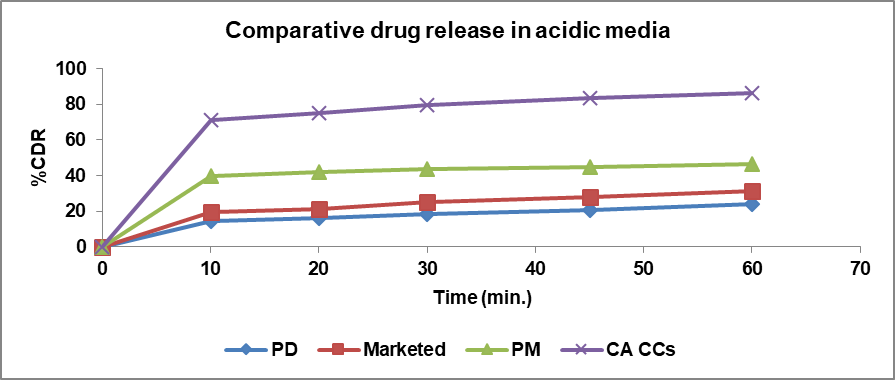 In vitro dissolution studies were conducted using 0.1N HCl (pH 1.2) and Phosphate Buffer (PBS) (pH 7.4) at 37±0.5 C in a USP type II apparatus. The release profile was evaluated for glibenclamide alone, a marketed formulation, a physical mixture, and cocrystals in both media. The dissolution profiles were determined at 10, 20, 30, 45, and 60 min in the dissolution media. The percentage of Cumulative Drug Release (% CDR) at different time intervals is shown in fig. 10 and 11. The % CDR values indicate that the dissolution profile of the cocrystals increased as compared to the pure drug, marketed formulation, and physical mixture in both acidic and basic media. The increased dissolution rate of the drug from the cocrystals is believed to be due to the coformer’s presence, which alters the solvation and lattice energies [37]. Cocrystals have a crystalline nature and weak hydrogen bonds formed between the functional groups of the drug and coformer are also a reason for the improved dissolution profile of the cocrystals.