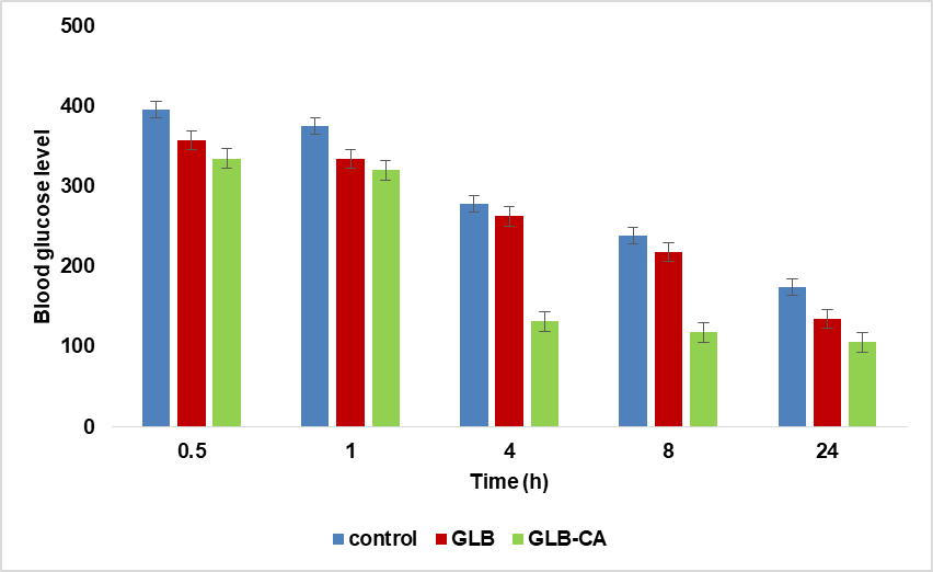 To determine the antidiabetic effect of the pure drug (GLB) and its cocrystals, blood glucose levels were measured at different time intervals (30 min., 1 h, 4 h, 8 h, and 24 h) after the oral administration of a solution of the drug and cocrystals solutions in diabetic rats. Group 1 served as the diabetic control group, where diabetes was induced through streptozotocin injection. The animals were left untreated with any antidiabetic agent and received only the vehicle during the experiment. Animals in Group 1 did not show any significant reduction in blood glucose levels when compared to the groups treated with antidiabetic drugs (Group 2 and Group 3) at any of the time intervals. The maximum reduction in blood glucose levels was observed in group 3 (treated with cocrystals) compared to group 2 (treated with pure drug). In the cocrystals, the maximum reduction in blood glucose levels was observed within 4-8 h [39]. Group 2, treated with pure drug, also showed a reduction in blood glucose levels, but to a lesser extent compared to group 3, which was treated with cocrystals loaded with the drug. Blood glucose levels significantly decreased in all treatment groups compared to the control group at all time points (p<0.05). The maximum reduction in blood glucose was observed in the GLB-CA group, with the most pronounced effect noted at the 24 h time point.