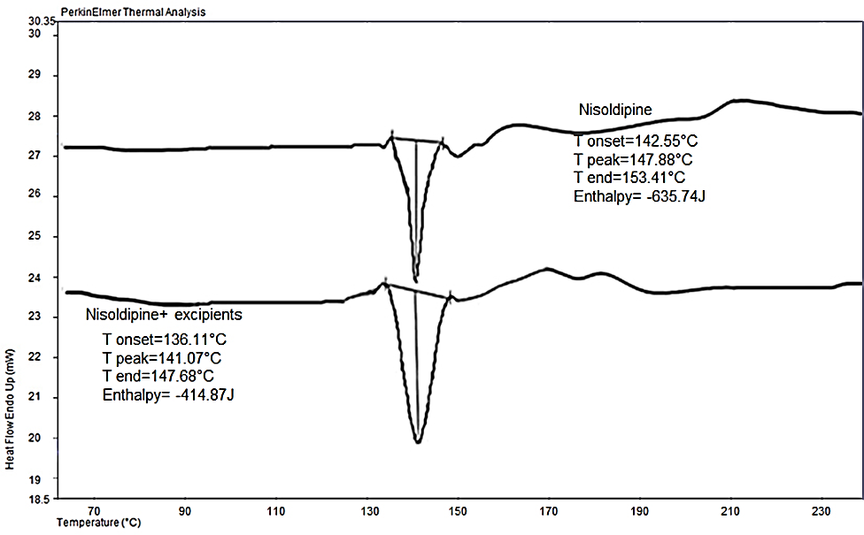 DSC thermograms of NSD alone and in combination with excipients were utilized to illustrate the effective interaction of the NSD with the excipients. These thermograms indicate good miscibility between the NSD and the excipients, demonstrating their compatibility and suggesting potential enhancements in formulation stability and effectiveness (fig. 1).