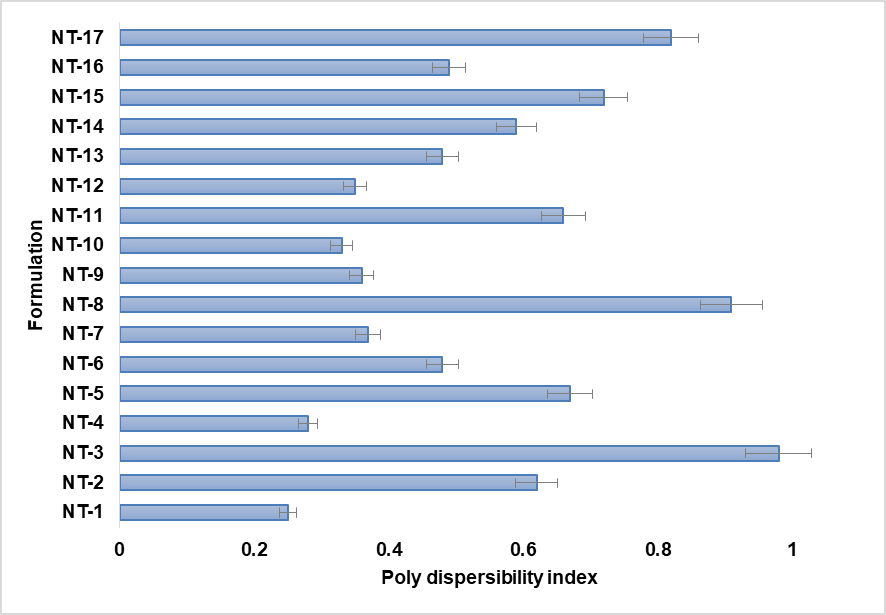 Fig. 4: Poly dispersibility index of the formulations, value are given in mean±SD; n=3. Error bars indicate SD