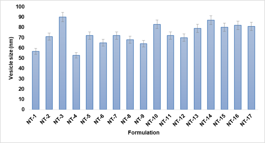 DPPC and span-80 were dissolved in a mixture of chloroform and ethanol (2:1 ratio). The solvent was removed using rotary evaporation for 15 min followed by overnight vacuum drying to eliminate any residual solvent. The lipid films thus formed were reconstituted by hydrating them with 10 ml of phosphate buffer at pH 6.8 containing NSD. The hydration process involved rotating the mixture for 45 min. The resulting transfersomal suspension was stored refrigerated at 4 °C [13, 14]. A total of 17 formulations were made using the Box-Behnken Design method facilitated by Design Expert software (table 1).