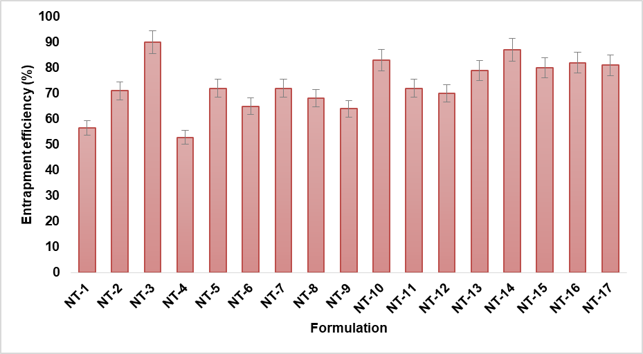 Among the NTs, formulation NT-3 demonstrated smaller VS, improved ZP, and higher EE%. Consequently, this formulation was further incorporated into TPs.